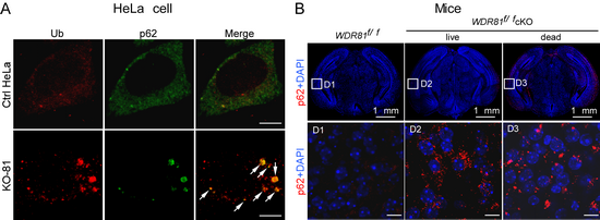 (A)细胞中WDR81的缺失导致泛素化蛋白(Ub)和自噬受体分子p62的累积;(B)小鼠脑部缺失WDR81导致自噬受体分子p62的累积
